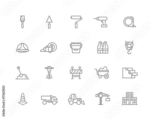 Set of vector construction and repair line icons. Brush, roller, drill, helmet, paint, cone, crane, hook, wall, truck, cament, jackhammer, excavator, workwear, fence, builder and more. Editable Stroke