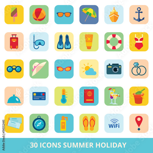 Set of vector flat icons summer beach vacation and travel