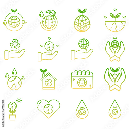 Set of vector icons related to environmental awareness. Vector illustrations such as love for the environment, care for the environment and others with editable gradient lines.