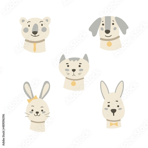 Set of vector illustrations in flat style with cute animal characters isolated on white background. Cartoon faces, stickers, avatars. Collection of icons for baby clothes, cards, invitation templates.