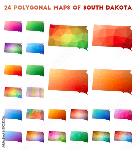 Set of vector polygonal maps of South Dakota. Bright gradient map of US state in low poly style. Multicolored South Dakota map in geometric style for your infographics.
