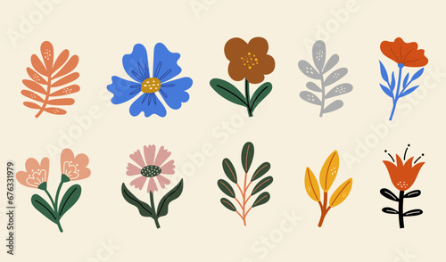 Set of vector silhouettes of bright leaves and original flower. Isolated on a white background. Drawing sketches of leaves. Silhouettes of flower flora.