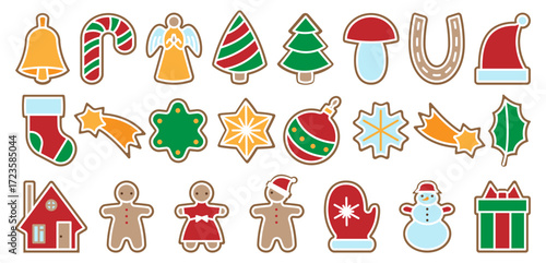 Set of vector silhouettes of Christmas cookies. Gingerbread man, tree, star, snowman, holiday biscuit shapes, festive baking cutters, Xmas decorations