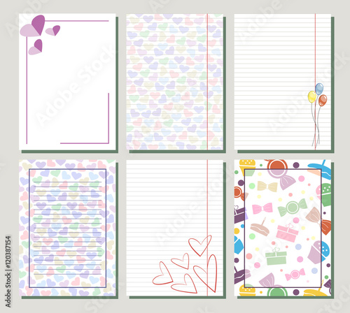 Set of vector templates for letter or greeting card. Different simple forms with frame, gift, hearts. A4 format.