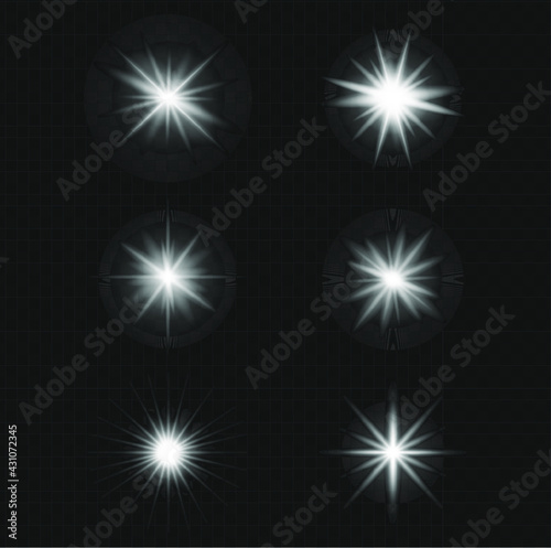Set of vector transparent flash light effect, sunlight special lens. Bright gold flashes and glares