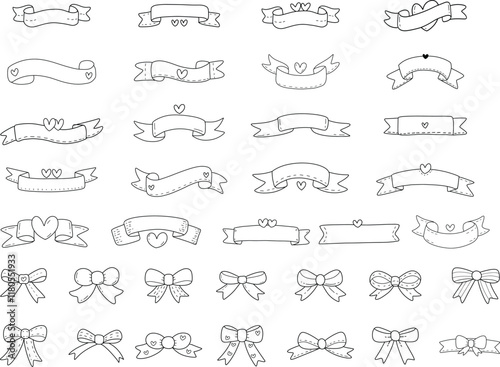 Set of vintage hand drawn ribbons and bow heart .Collection of retro labels, banners for valentine, logo elements,design. Vector Illustartion
