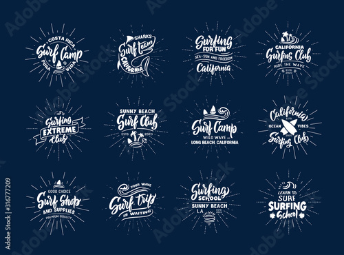 Set of vintage Surfing. Retro emblems, badges, logos, phrases, slogans, stamps.