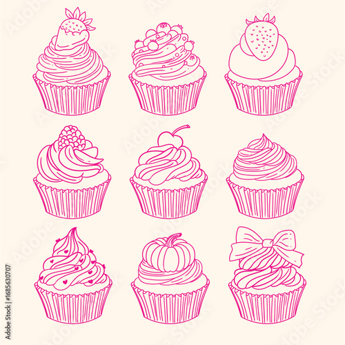 Set of vintage-style cupcake illustrations, minimalist line drawings in vector for bakeries, cafes, birthdays, cards, menus, cakes, or graphic design.