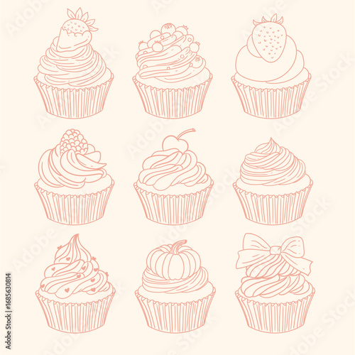 Set of vintage-style cupcake illustrations, minimalist line drawings in vector for bakeries, cafes, birthdays, cards, menus, cakes, or graphic design.