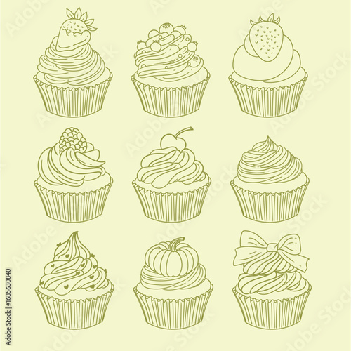 Set of vintage-style cupcake illustrations, minimalist line drawings in vector for bakeries, cafes, birthdays, cards, menus, cakes, or graphic design.