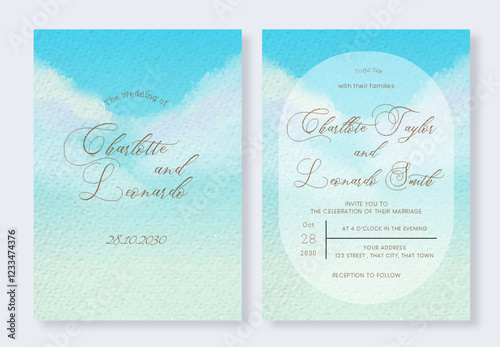 Set of Watercolor blue sky with Nature floral field landscape wedding invitation template