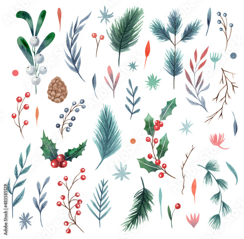 Set of watercolor floral winter elements. Hand drawn botanical elements for your design.