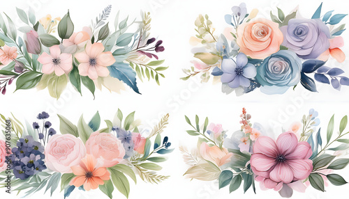 set of watercolor pastel flower decoration on wedding table with flowers
