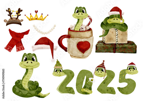 Set of watercolor snakes, cute Christmas snakes, symbol 2025 years