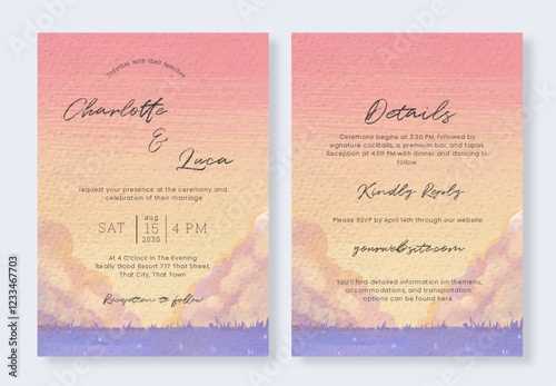 Set of Watercolor sunset sky with floral field landscape wedding invitation template