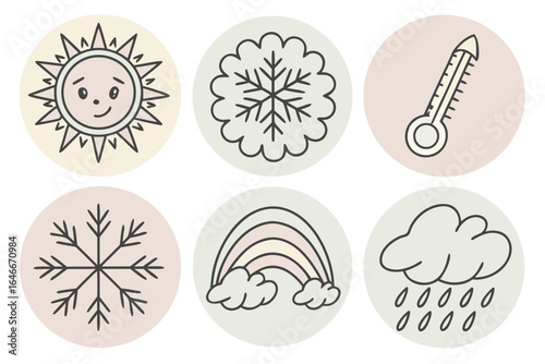 Set of weather icons including sun, snowflake, thermometer, rainbow, and rain