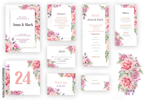 Set of wedding invitation card, rsvp, thank you card, reception, menu with rose, berries, leaves. Wedding concept. Floral poster, invitation, greeting card, background