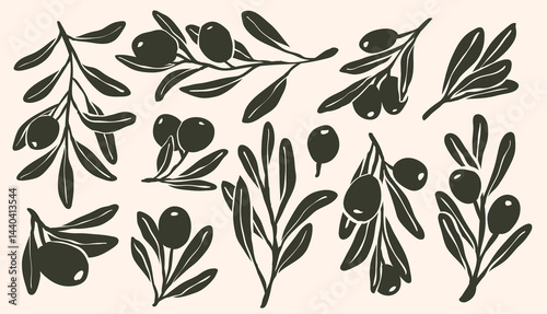 Set of whimsical olive branch with leaves and olive oil logo or olive tree icon, hand drawn olive border botanical medicine herbs in vector format, floral olive frame