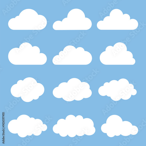 Set of white cloud icons on a blue background. Cloud icons in various shapes. Perfect for weather apps, cloud designs, and sky illustrations. Weather illustration, vector set.