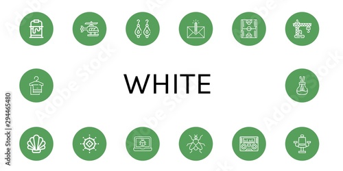 Set of white icons such as Paint bucket, Helicopter, Earrings, Envelope, Soccer field, Crane, Shell, Sun, Bug, Fly, Radio, Chair, Towel, Scent , white