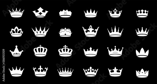 Set of white vector king crowns icon on black background. Vector Illustration. Emblem, icon and Royal symbols.