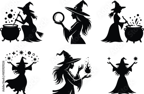 Set of witches silhouettes flying on a broomstick, a Magic female in a witch hat. Which SVG of a scary personage.