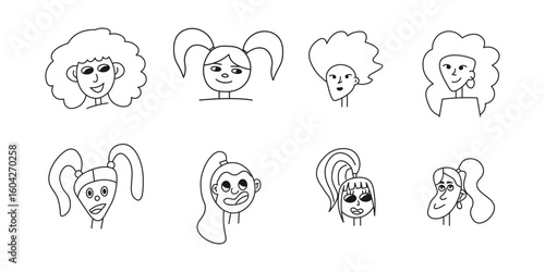 Set of woman, girl character avatars, heads, faces doodle, line art