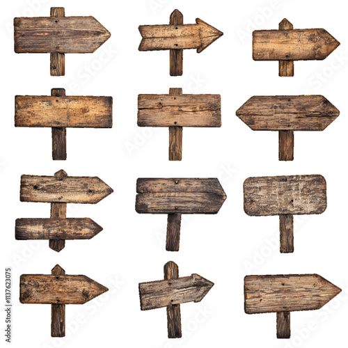 Set of wooden signposts with various arrows pointing in different directions, cut out isolated on white or transparent background