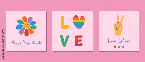 Set of y2k retro posts with LGBT symbols. Happy Pride Month cards, banners, prints. Hand drawn flat style vector illustrations.