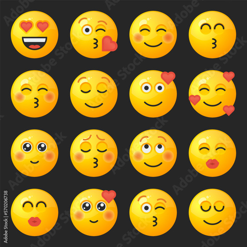 Set of yellow round emoticons for social networks or web design with different facial expressions.