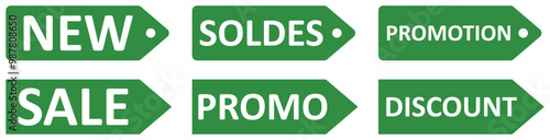 Set of yellow sale quality tags and labels isolated. Shopping stickers and badges. Discount sticker product tag set. Special offer, soldes, new, sale, discount, Promo.
