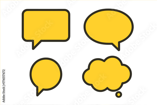 Set of yellow speech and thought bubbles. Vector chat box, message, dialog, comment balloon icons. Flat cartoon illustration for communication, comics, and social media.