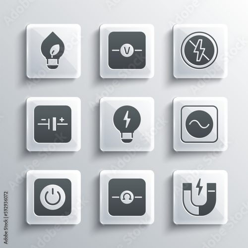 Set Ohmmeter, Magnet, AC voltage source, Creative lamp light idea, Power button, DC, Light bulb with leaf and No lightning icon. Vector