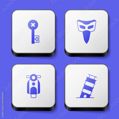 Set Old key, Carnival mask, Scooter and Leaning tower in Pisa icon. White square button. Vector