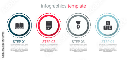 Set Open book, Exam sheet with A plus grade, Fountain nib and ABC blocks. Business infographic template. Vector