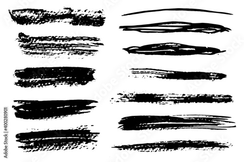 Set oSet of isolated black textured grunge brush strokes. Dirty hand drawn inky lines and blobs for graphic design, decorationf isolated black textured brush strokes