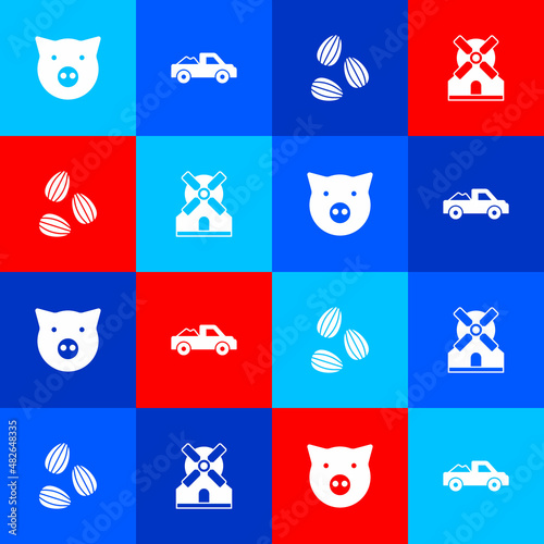 Set Pig, Pickup truck, Seeds and Windmill icon. Vector