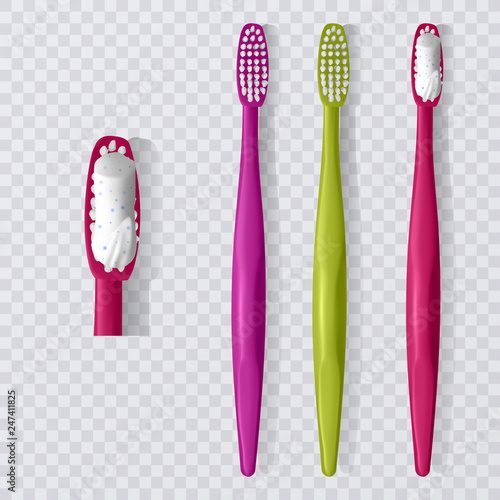 Set plastic toothbrush, the top view, realistic toothbrush on a transparent background. Vector illustration