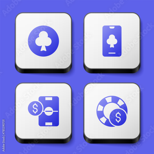 Set Playing card with clubs symbol, Online poker table game, Football betting money and Casino chips icon. White square button. Vector