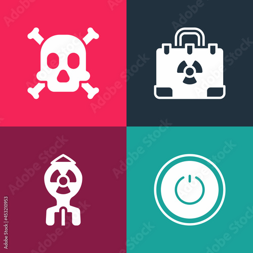 Set pop art Power button, Nuclear bomb, Radiation nuclear suitcase and Bones and skull warning icon. Vector