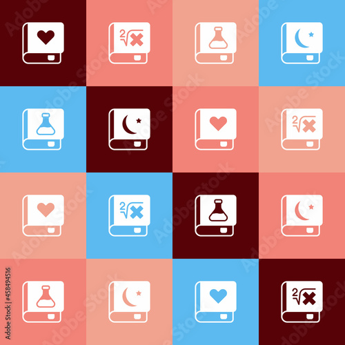 Set pop art Romance book, Book with mathematics, Chemistry and Holy of Koran icon. Vector
