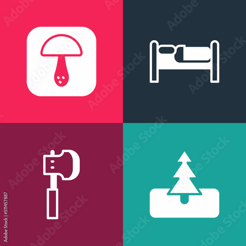 Set pop art Tree, Wooden axe, Bed and Mushroom icon. Vector