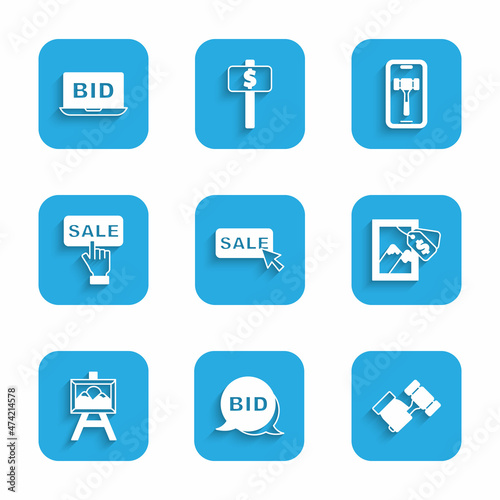 Set Price tag with Sale, Bid, Auction hammer, painting, Online auction and icon. Vector