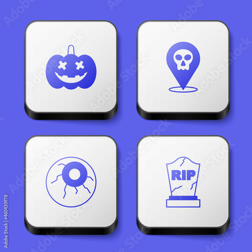 Set Pumpkin, Skull, Eye and Tombstone with RIP written icon. White square button. Vector