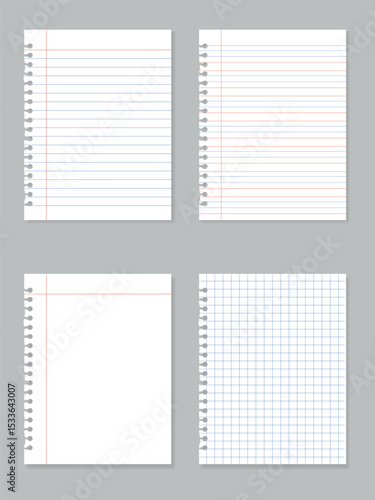 Set realistic torn notebook or workbook sheet vector illustration with shadow isolated with white background