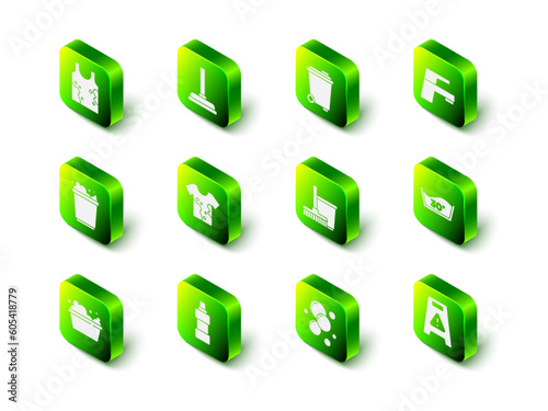 Set Rubber plunger, Trash can, Water tap, Temperature wash, Wet floor, Mop and bucket, Soap water bubbles and Bottle for cleaning agent icon. Vector