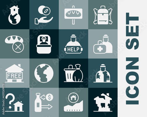 Set Ruined house, Homeless, First aid kit, Donation food, Sleeping bag, Shelter for homeless and Help icon. Vector