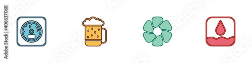 Set Sauna thermometer, Wooden beer mug, Flower and Water drop icon. Vector.