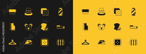 Set Sewing thread on spool, Electric iron, Leather, button for clothes, Teddy bear plush toy, Layers clothing textile, Textile fabric roll and Thimble sewing icon. Vector