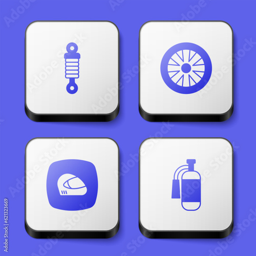 Set Shock absorber, Alloy wheel for car, Racing helmet and Fire extinguisher icon. White square button. Vector
